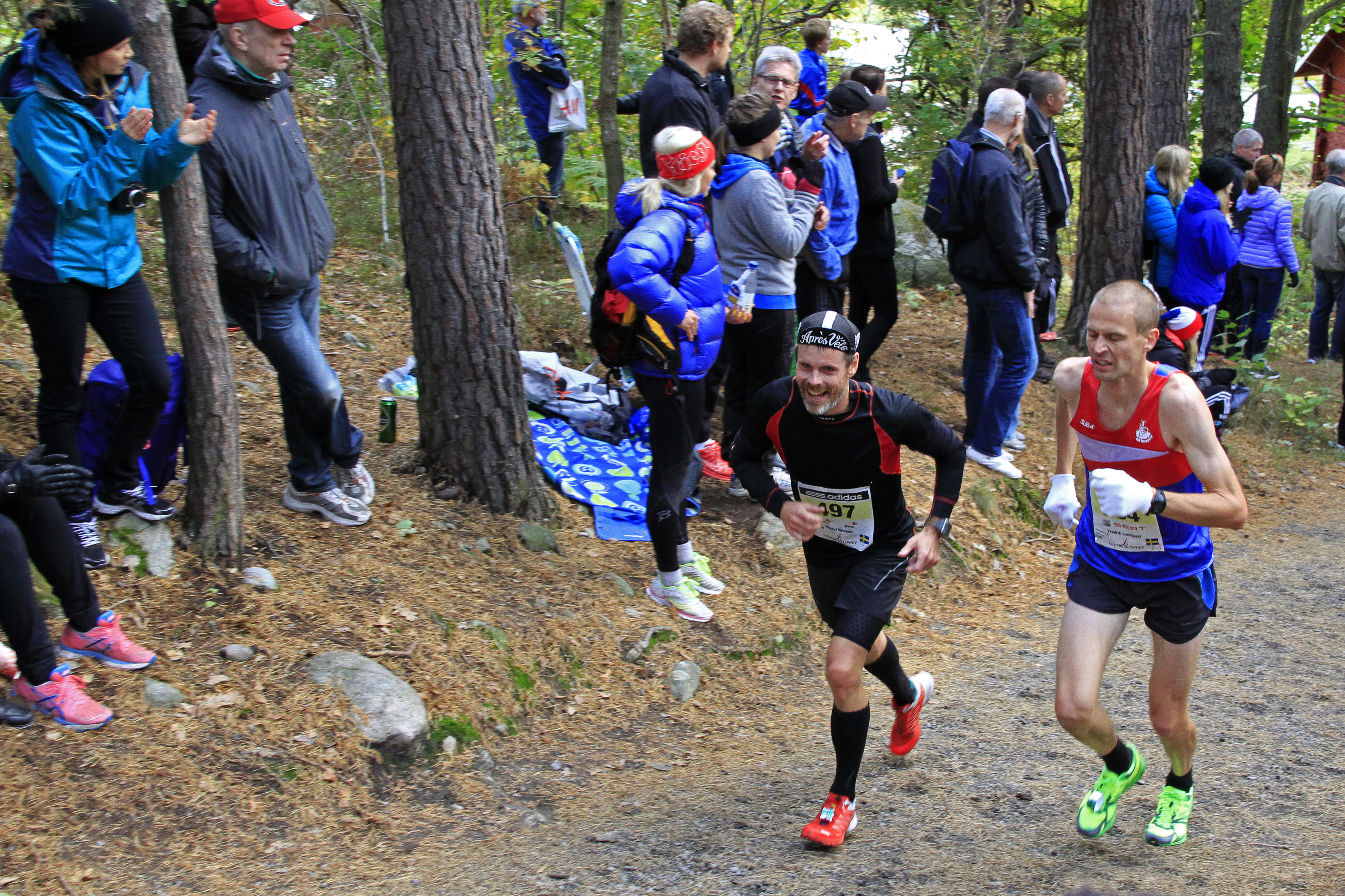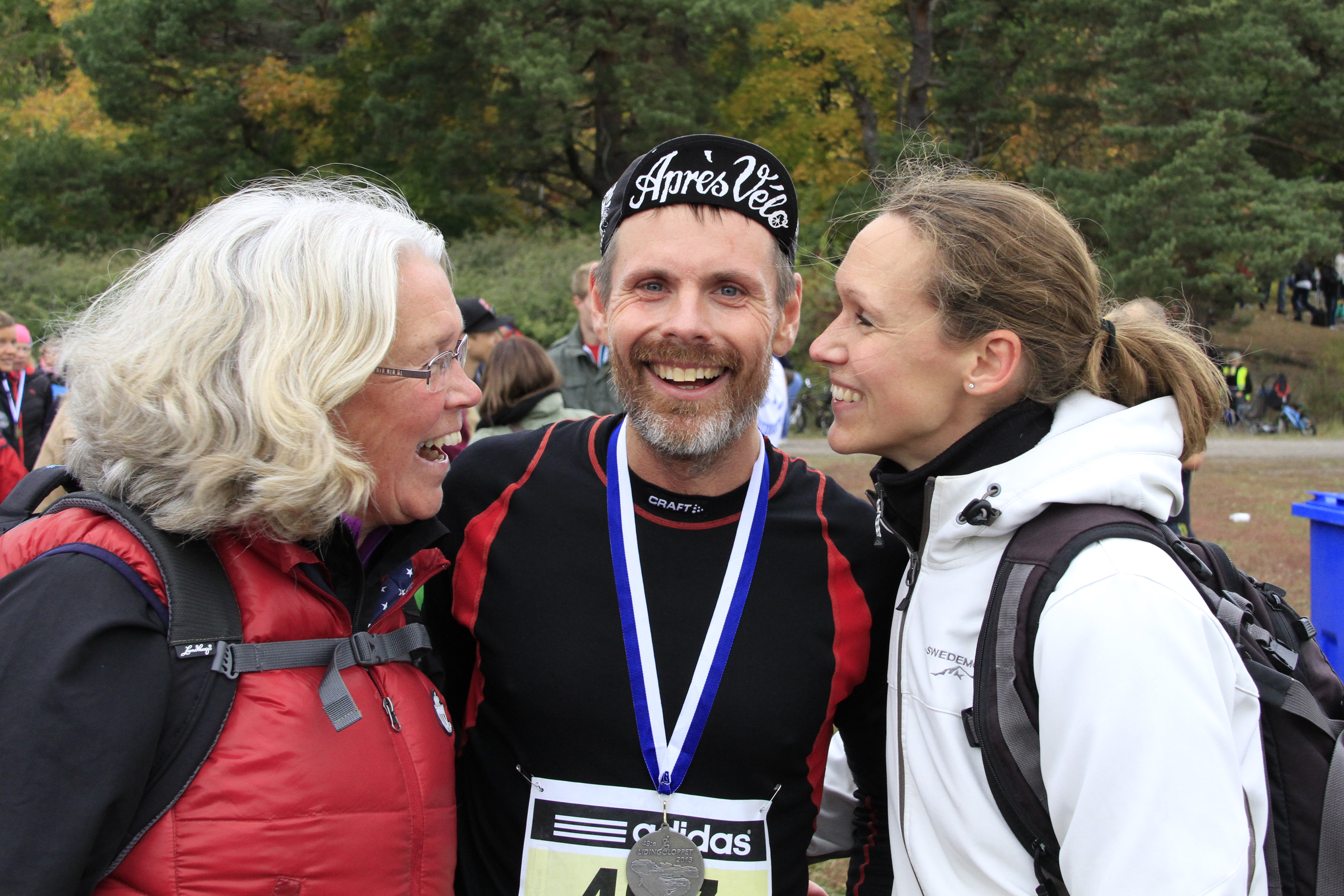 Igår var det då äntligen dags för Lidingöloppet 2013. Var ju väldigt revanchsugen efter förra årets DNF. Då kastade jag haltande in handduken efter 20 km med överansträngd vad. Helt annan känsla här i år kan jag säga! Ja i år ser jag riktigt glad ut ju:-) Jag startade i ledet bakom elitledet och kom väl i väg runt 300:e gissar jag. Mycket kryssande i början för att komma fram till löparna runt 100:e plats. Men kanske bra då man inte ens har möjlighet att rusa i början. Det släpps upp efter några km. Och sen är det fritt fram att köra på. Kändes väldigt bra och kom in i ett skönt flyt där jag låg på runt 3,45/km. Skönt att ha lite tid tillgodo. Det behövs när andra tuffare halvan av loppet börjar. Plockade placeringar sakta men säkert.  Kändes kontrollerat hela tiden. Efter 15 km börjar loppet på allvar. Med små uppförs och utförsbackar slits kroppen ned och lätt att tappa rytmen. Skönt ändå med lite kupering. Då brukar jag ta en del placeringar. Det som för mig sliter mest är dock dom branta nedförsbackarna. Ogillar dom väldigt mycket. Uppför är däremot ett trevligt inslag. När sista milen börjar händer grejer i kroppen som inte har så mycket med konditionen att göra. Energin börjar ta slut en del. Men min värsta motståndare var krampkänningar lite överallt som började vid ca 22 km. Och smärta i fotdynorna bakom stortån. Det beror på att det blir mycket framfotslöpning i tävlingsskorna. Mina medtävlare hade nog minst lika jobbigt med utmattningssyndrom. Tog ca 20 placeringar på sista milen. Alltid bra för självförtroendet. Och skönt psykiskt att känna att dom andra är ännu tröttare…) En härlig känsla dom sista km att veta att mitt mål under 2 timmar kommer jag klara med råge. Sluttiden blev 1.55.04. Det räckte till en 53:e plats. Jag är ju helt otroligt glad över detta resultat! Som jag skrivit tidigare är det underbart att folk som jag känner står och hejar på. Då har man något att se fram emot hela tiden. Och man kan vid dessa tillfällen även få fram ett litet leende:-) Mia och mina svärföräldrar och syrran med familj var på plats och hejade fram mig. Svärfar har även tagit fotona i detta inlägg.