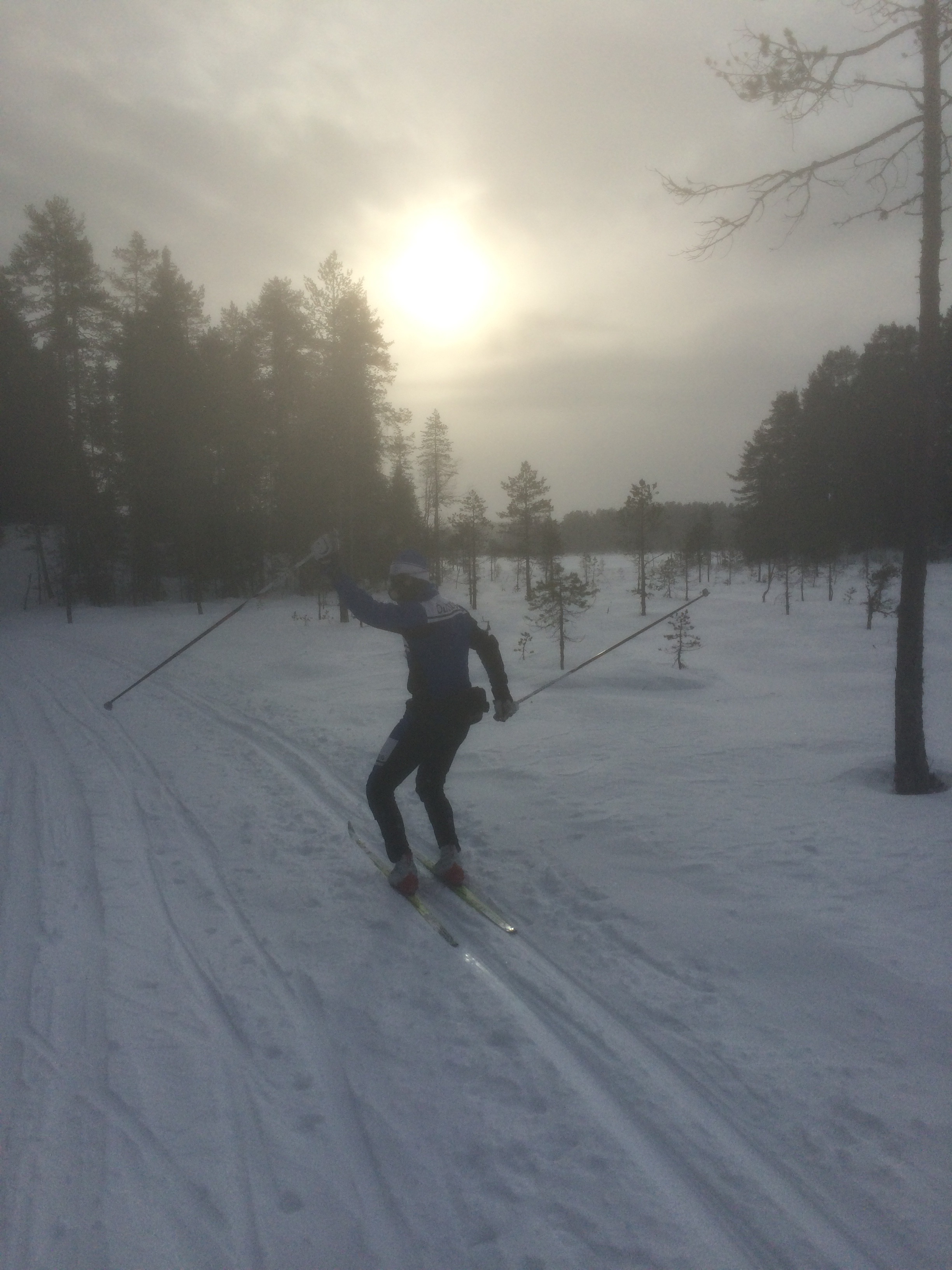 Ajaj, åkaren framför börjar fippla med klockan efter några hundra meter och omöjligt att åka om. Jaja. rättar in mig i ledet. Ser bror längre fram. Kommer jämsides med honom efter första branten i backen och säger hej, men ser sen att hans spår försvinner jämfört med mitt. Vi ses i Mora käre bror… Märker att det minimala fäste jag lade på var som befarat helt onödigt. Knappt ett uns av fäste. Lika bra att staka då. Tog nåt diagonaltag nån gång för att kolla om det bet nåt men inte. I 2:a led är det rätt mycket kö i första backen och då hänger man med armarna bättre i en stakrörelse än i en diagonalrörelse. Kul så här i efterhand att man vet att det går att staka sig igenom loppet. För övrigt så hör jag mer svordomar i första backen denna söndag än vad jag gör på hela övriga året. Alltså denna hets i första backen! Folk kliver verkligen över lik här. Hör mig själv skrika ”NU TAR ALLA DET JÄÄÄVLIGT LUGNT OCH FINT” Klarar dock backen utan stavbrott och någon vidare pulshöjning. Den här biten går i snigelfart verkligen. Det flyter på bra på myrarna och jag känner att jag har bra glid under skidorna. Halva loppet är då känslomässigt gjort då man kommer upp helskinnad från backen och glidet är bra. Skönt! Bara sista 87…