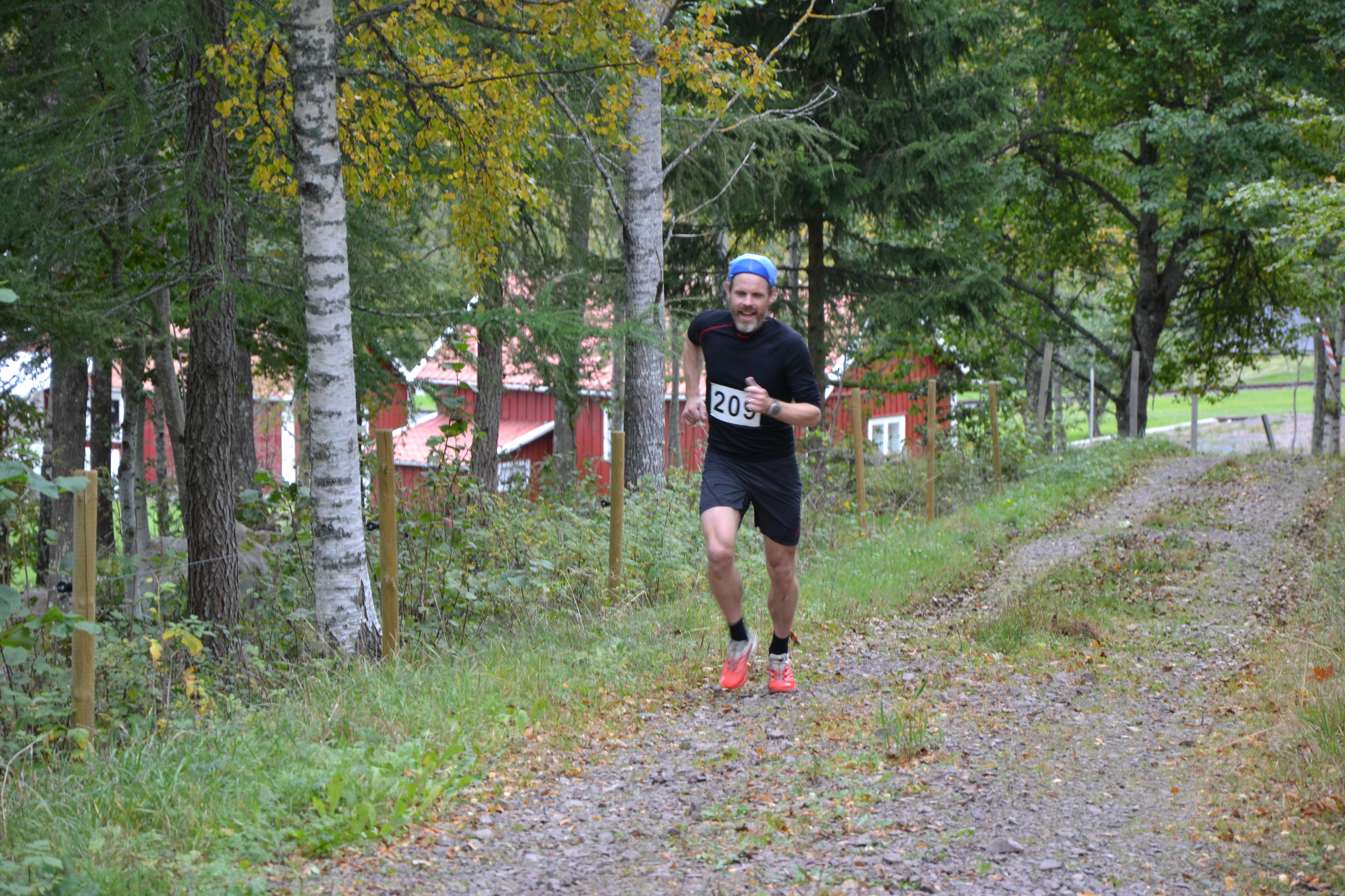 Viggo in action. Alltid lika glad:) 13 km och 5 km möts under loppet då vi springer åt motsatt håll. Fick äran att göra highfive med Viggo då vi möttes. Så då till vårt lopp. Bror står utan startpistol och skriker klara färdiga gå. Och så bär det i väg på detta rejält kuperade terränglopp. Ännu mer terräng de senaste två åren och lite längre, efter finjusteringar av bror. Och i väg bar det ordentligt för vinnaren Oscar Claesson. Ja jäklar vad det bar iväg. Oscar kom tvåa i m22 på Lidingöloppets 15 km för två veckor sedan. Så att hänga på hans rusning i början var bara en tanke som snabbt bröts ned i logiskt och klokt konsekvenstänkande. Men tvåa lade jag mig. Och blev ganska själv i skogen bakom Oscar. Min Vasaloppsambo sluggern aka Robban , Arvid och några till låg en bit bakom mig. Robban, Arvid, Oskar Lund och Johan Palmér driver för övrigt Sveriges roligaste konditionsidrottsblogg under namnet Holaveden. Jag matade på i ett tempo som passade mig bra och det kändes fint i kroppen. Såg Oscar på dryga 30 sekunders avstånd lite då och då och märkte att jag inte tappade allt för mycket på honom. Brorsan som följde täten med hjälp av en fyrhjulig mc talade om efter ca 9 km att Oscar var tvungen att besöka en skogsdunge för lite tömning. Och så var jag helt plötsligt men inte så rättvist i ledning av loppet. Men strax innan bergspriset i Berg fick jag som gillar backar en läxa av en yngling som ännu mer gillar backar…) Oscar var ikapp och förbi ett par hundra meter innan bergspriset.