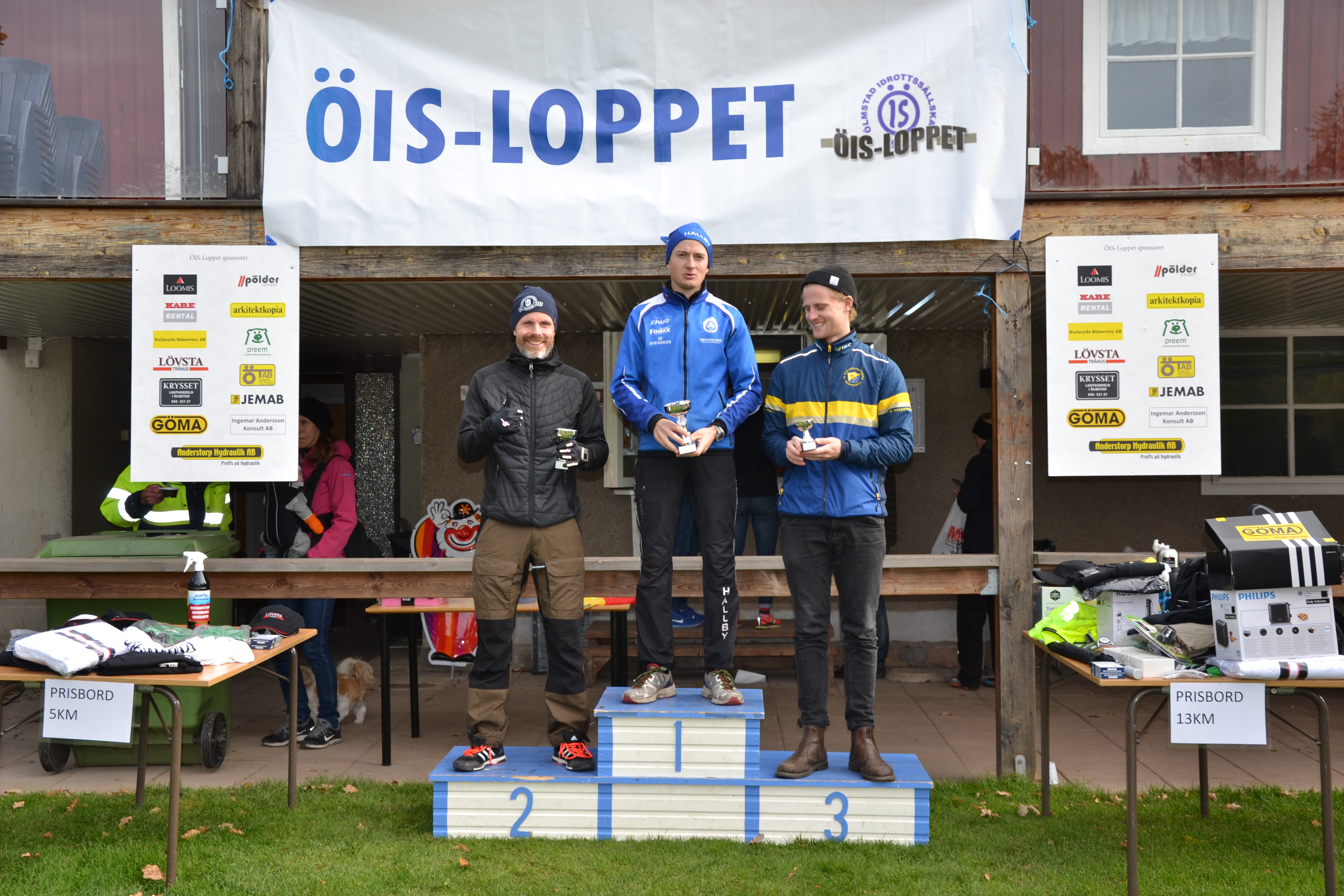 Här har vi pallen. Jag, Oscar och Arvid. Ja i lördags var det så äntligen dags. Efter att ha missat förra årets Öis-lopp var jag äntligen tillbaks. På brödrostloppens brödrostlopp. För den novise ska det berättas att ett brödrostlopp oftast innebär ett mindre lopp som gärna utspelar sig på landsbygden. Och där oftast en av deltagarna tillhandahålls en brödrost. Arvid som kom trea i loppet blev den lycklige innehavaren av en alldeles ny skimrande brödrost. Själv valde jag en superfin pannlampa. I detta roliga lopp är det riktigt fina priser. Presentkort, bergspriser, löparskor och just brödrostar. Till skillnad från Tjurruset där dom drar in miljontals kronor i anmälningsavgifter och min andraplats förra helgen generade i två kaffemuggar. Exakt samma kaffemuggar jag fick för min andraplats i Springcross förra året. Skillnaden var då att det stod under muggarna 2:a pris springcross. Förra veckans kaffemuggar (som för övrigt redan står på vinden) stod det då lämpligt 2.a pris tr…förkortning för Tjurruset. Visst att jag inte springer för fina prisbord. Men nån j…a måtta får det väl ändå vara! Ok, nog om det! Brorsan som är en riktig eldsjäl i Ölmstad är tävlingsledare för Öis-loppet. Så det är extra roligt att få köra detta lopp.